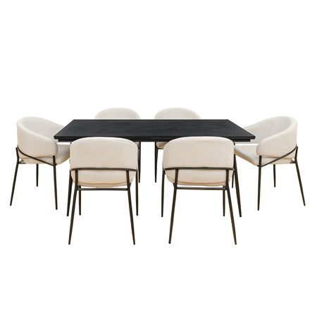 Las sillas, con estructura metálica hueca de alta resistencia, están tapizadas en tela color beige claro, ofreciendo un contraste cálido y una experiencia de asiento cómoda para largas sobremesas.